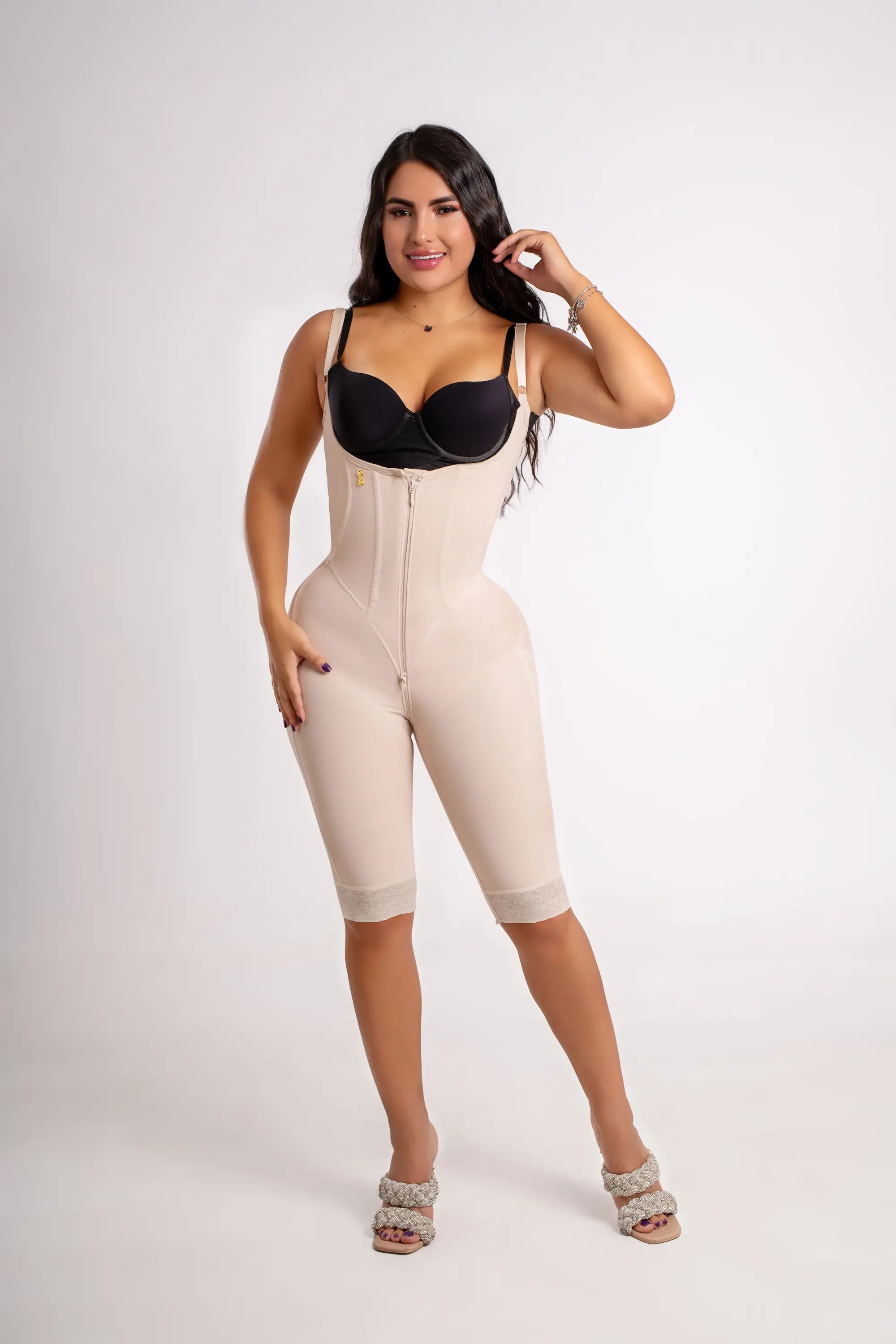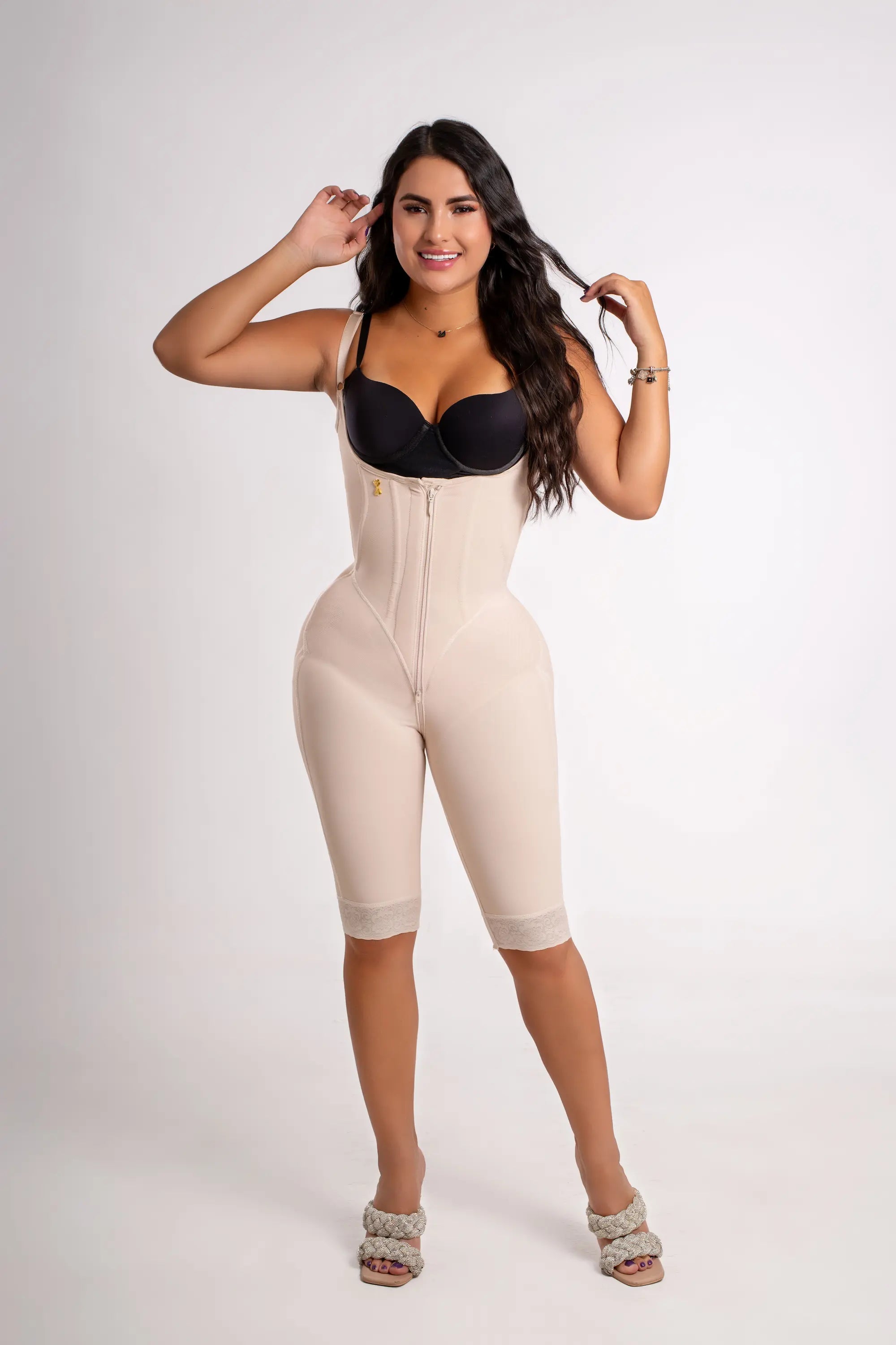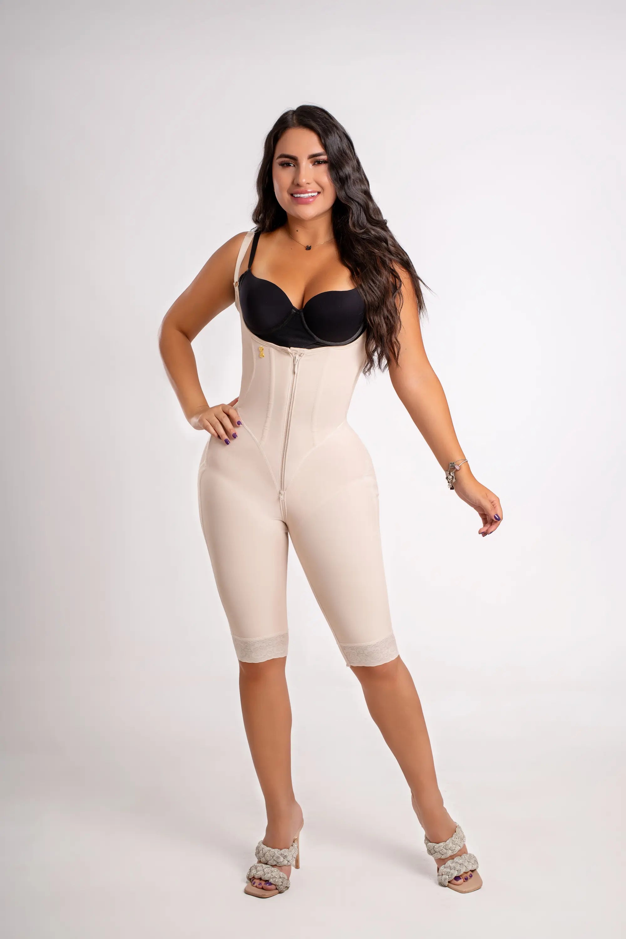 Transforma tu figura con nuestra faja de alto control hasta la rodilla, diseñada para brindar un ajuste perfecto, estilizar tu silueta y darte la confianza que mereces en cualquier ocasión. Su cierre frontal invisible garantiza discreción absoluta bajo la ropa, mientras que las tiras tipo brassiere en los hombros ofrecen mayor comodidad y soporte sin dejar marcas.