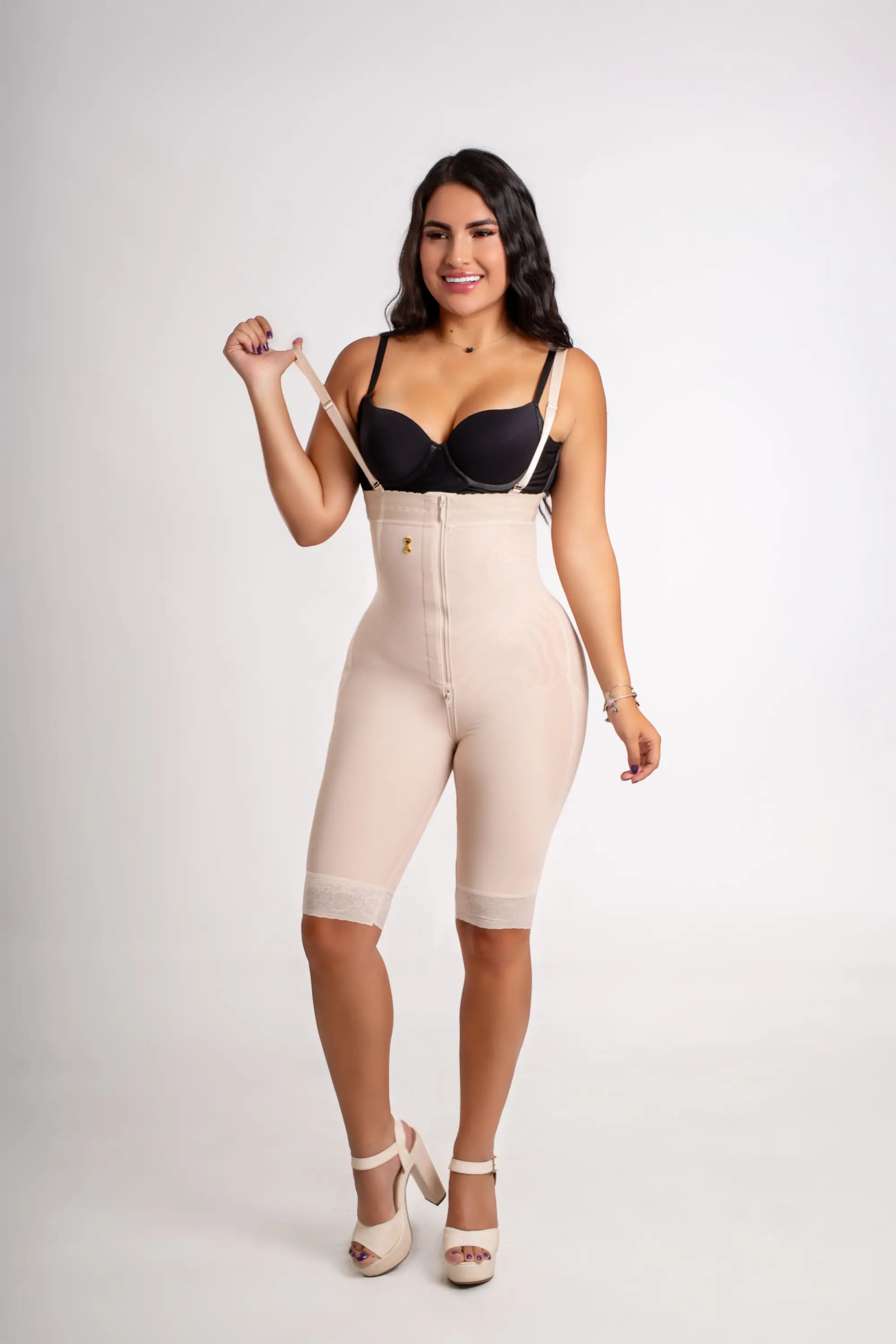 Consigue una silueta perfectamente moldeada con nuestra faja strapless de alta compresión. Diseñada para llegar hasta la rodilla, esta faja no solo ofrece un cierre frontal invisible que no se marca bajo la ropa, sino que también incluye un efecto levanta cola para realzar tus curvas de forma natural.